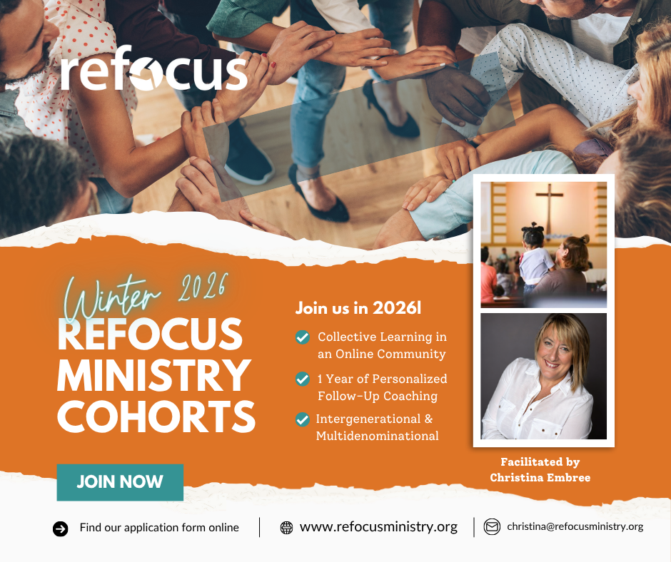 ReFocus Ministry Cohorts provide ministry leaders with the opportunity to expand their leadership skills in a twelve-week shared learning experience. Facilitated by Christina, a cohort group of 4-6 individuals from multiple denominational backgrounds meet weekly to explore and apply the principles of leadership in generational discipleship, intergenerational ministry, and church culture transition.